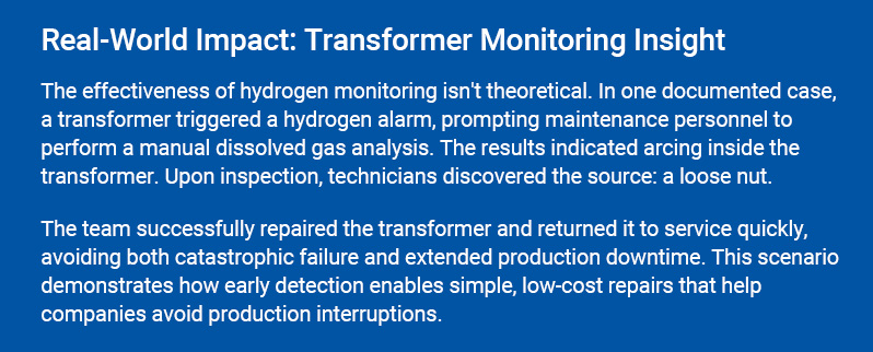 The effectiveness of hydrogen monitoring isn’t theoretical. In one documented case, a transformer triggered a hydrogen alarm, prompting maintenance personnel to perform a manual dissolved gas analysis. The results indicated arcing inside the transformer. Upon inspection, technicians discovered the source: a loose nut.