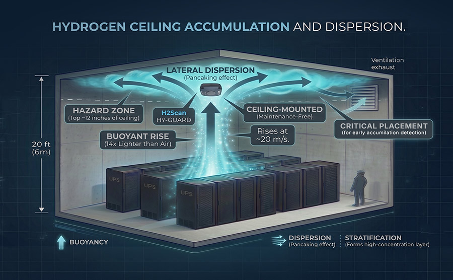 Hydrogen is significantly lighter (14x times) than air and rises rapidly once released. Upon reaching the ceiling, it tends to spread laterally, following airflow patterns and migrating toward ventilation or exhaust points. This behavior can lead to elevated concentration zones near the ceiling, where hydrogen levels may increase before being detected by sensors positioned lower in the space.